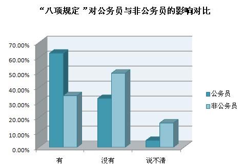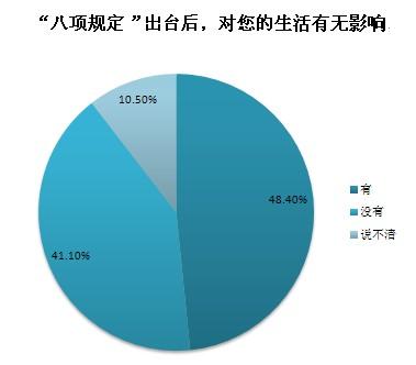截至2013年12月20日10時,共收到網絡問卷2442份,48.4%的受訪者認為“八項規定”對個人生活有影響,其中公務員群體認為“八項規定”帶來的最大影響是“公務吃請少了,能抽出更多時間陪伴家人”和“津貼補貼獎金少了,勒緊褲帶過日子”,非公務員群體認為“八項規定”帶來的最大影響是“酒店、高端會所門外的公務用車少了”和“遇到領導考察工作時,地毯鮮花迎送領導的情況少了”。