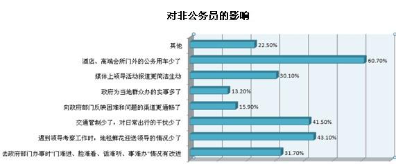 還有三到五成受訪公務員認為“辦公經費控制更嚴格,需要更加節約地使用辦公用品”、“群眾滿意度在業績考核中比重增加,工作態度更認真了”和“陪同領導考察工作的情況少了,能抽出更多時間處理其他工作”是“八項規定”帶來的幾大影響。