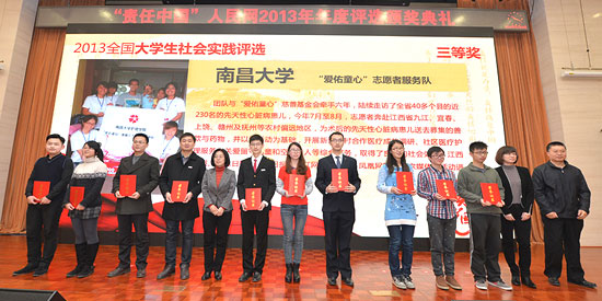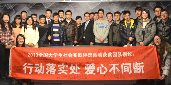 人民網(wǎng)北京1月15日電 (記者 張葳)1月15日,2013全國(guó)大學(xué)生社會(huì)實(shí)踐評(píng)選活動(dòng)舉行頒獎(jiǎng)和座談活動(dòng),獲獎(jiǎng)大學(xué)生代表上百個(gè)團(tuán)隊(duì)發(fā)表了倡議書,號(hào)召全國(guó)大學(xué)生們?cè)谏鐣?huì)實(shí)踐中做到“行動(dòng)落實(shí)處,愛(ài)心不間斷”,經(jīng)常性、持續(xù)性地走進(jìn)社會(huì)、服務(wù)基層,拒絕形式主義。