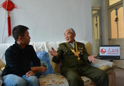 人民網(wǎng)記者采訪抗戰(zhàn)老兵史保東。(于紅林 攝)