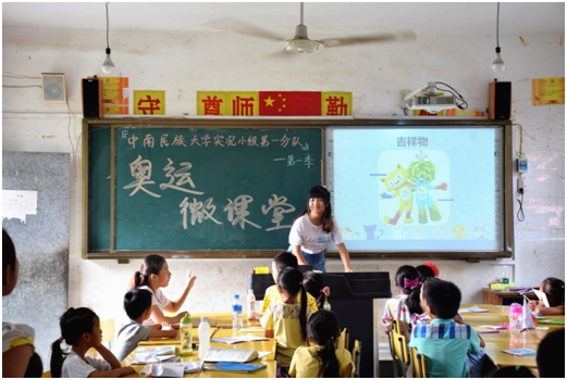 中南民族大學(xué)的實況小組志愿服務(wù)隊到貴州從江縣貫洞鎮(zhèn)龍圖小學(xué)支教,針對當(dāng)?shù)亓羰貎和狭艘惶镁实膴W運微課堂,并組織開展了龍圖小學(xué)趣味運動會,將奧運理論與實踐相結(jié)合,傳遞奧運精神。