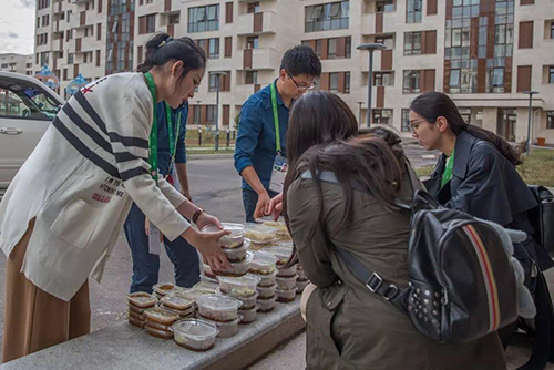 聽了介紹,更加渴望見到我們的大廚啦。劉芳總監為我們提供了一個便利,讓我們趁大廚送飯的時候近距離接觸大廚。隨后我們來到世博村內的送餐地點,有幸看到兩位大廚正在給志愿者們分發盒飯。