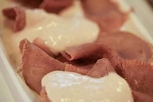 雖然造型簡單,但要做好這道傳統的前菜Carpaccio,烹飪前就要花足功夫。首先要選取優質的牛肉切片,用蒜茸、胡椒粒以及美酒、Rosemary浸沒腌制,至少得用五六個小時。然后將腌好的牛肉鋪在保鮮膜上,像卷壽司一樣把牛肉片卷起來,放在冰箱中冷凍,既能讓腌料更均勻地滲入到肉中去,也讓濃烈的酒味充分揮發。