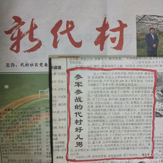 前后200多人參軍參戰(zhàn),用青春譜寫戰(zhàn)歌,用奉獻(xiàn)報(bào)效祖國(guó)。這是代村人的驕傲,更是我們國(guó)家的驕傲。