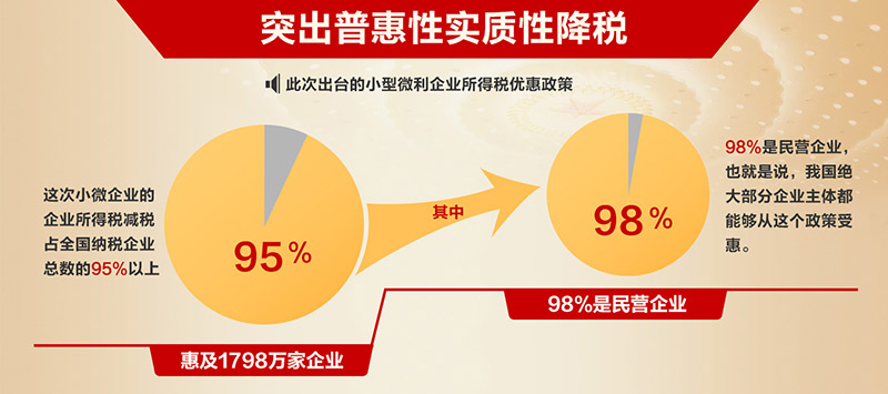 不僅是擴大了優惠面,還提高了優惠力度。稅率優惠方面,按應納稅所得額不同,分別采用所得稅優惠稅率。其中,應納稅所得額100萬元以下,稅負是5%,低于標準稅率20個百分點。應納稅所得額是100萬—300萬元之間的,稅負是10%,低于標準稅率15個百分點。這些數字,實實在在,真金白銀,非常重要。