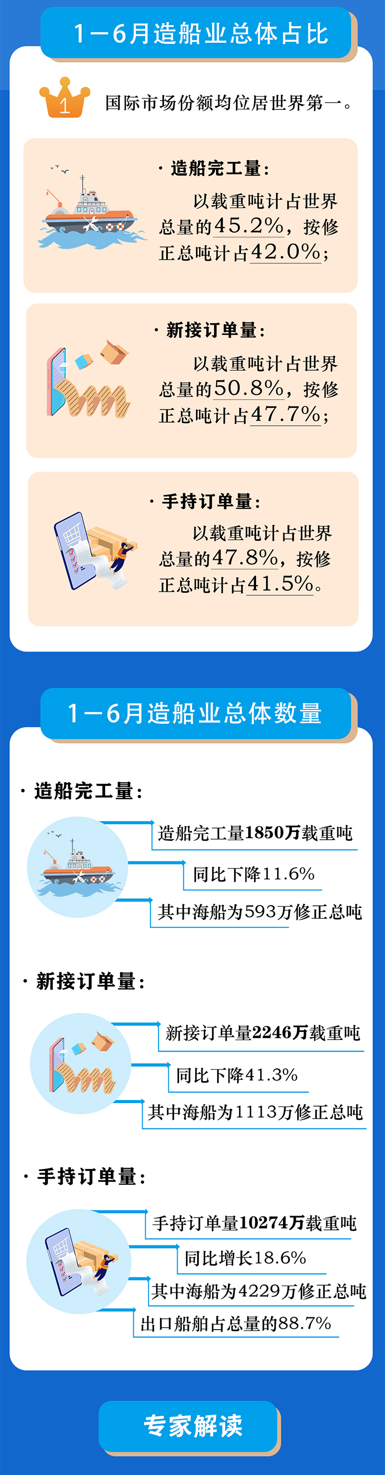 今年上半年,我國造船完工量、新接訂單量、手持訂單量三大指標在國際市場的份額繼續位居世界第一。分別占世界總量的45.2%、50.8%和47.8%,按修正總噸計分別占42.0%、47.7%和41.5%。