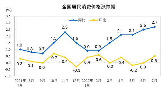7月份,CPI環(huán)比上漲0.5%,同比漲幅略有擴大,上漲 2.7%。