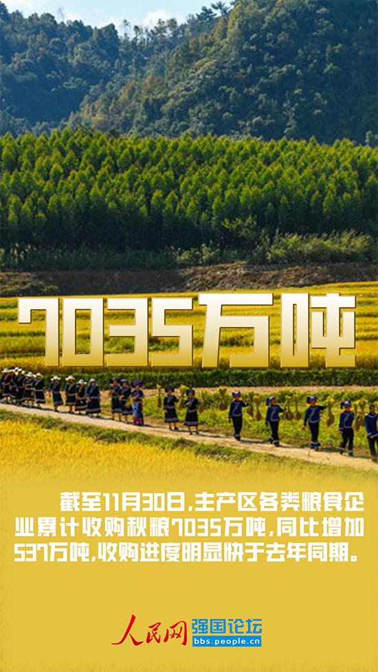 隨著各地大規模秋收結束,秋糧開始集中上市交易。據國家糧食和物資儲備局最新發布,截至11月30日,主產區各類糧食企業累計收購秋糧7035萬噸,同比增加537萬噸,收購進度明顯快于去年同期。“相比于2021年、2020年、2019年的6498萬噸、6803萬噸、5614萬噸,與歷年同期相比,今年達到了近年來糧食企業秋糧收購數量的最高值。”李新海說道。