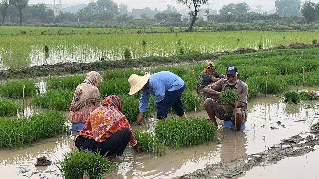 龍春久教授(中)與巴基斯坦當(dāng)?shù)剞r(nóng)民在拉合爾隆平南亞種子研發(fā)中心試驗田里忙碌著。(人民網(wǎng)記者 周晶攝)